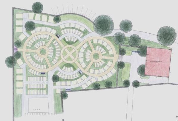Die Planung geht von alten christlichen Symbolen aus. Der Kreis als Symbol für die Vollkommenheit, das Kreuz, das auch die vier Elemente darstellt (Feuer, Wasser, Erde, Luft) und so für die Erde steht, das X, ein altes Symbol für Jesus Christus, die Lemniskate - in der Mathematik Zeichen für Unendlichkeit - hier das ewige Leben ausdrückend. Die beiden Flächen in der Lemniskate sind jeweils dreigeteilt. Ein Feld repräsentiert den dreifachen Gott, die Trinität: GOTT-Vater, GOTT-Sohn, GOTT-Heiliger Geist, das andere den dreifachen, nach GOTTES Ebenbild erschaffenen Menschen: Körper, Seele, Geist. Beide, Mensch und GOTT, waren durch den Sündenfall völlig voneinander getrennt. Den Weg für den Menschen, zu GOTT zurück, ebnete Jesus Christus für seinen stellvertretenden Sühnetod am Kreuz. Der Mittelpunkt der sich kreuzenden Lemniskatenlinien, eingefasst in den Kreis der Vollkommenheit, steht für den Heiland. Er ist die "Brücke", der Weg, die einzige Tür, zurück zum Schöpfer. Um 45° versetzt ergibt sich ein Kreuz im Kreis. Diese wiederum stellt die "vergeistigte Erde" dar, anders ausgedrückt, das "neue Jerusalem". Diese steht wiederum mit dem Christus in Verbindung, denn durch IHN kommt es auf die Erde herab.