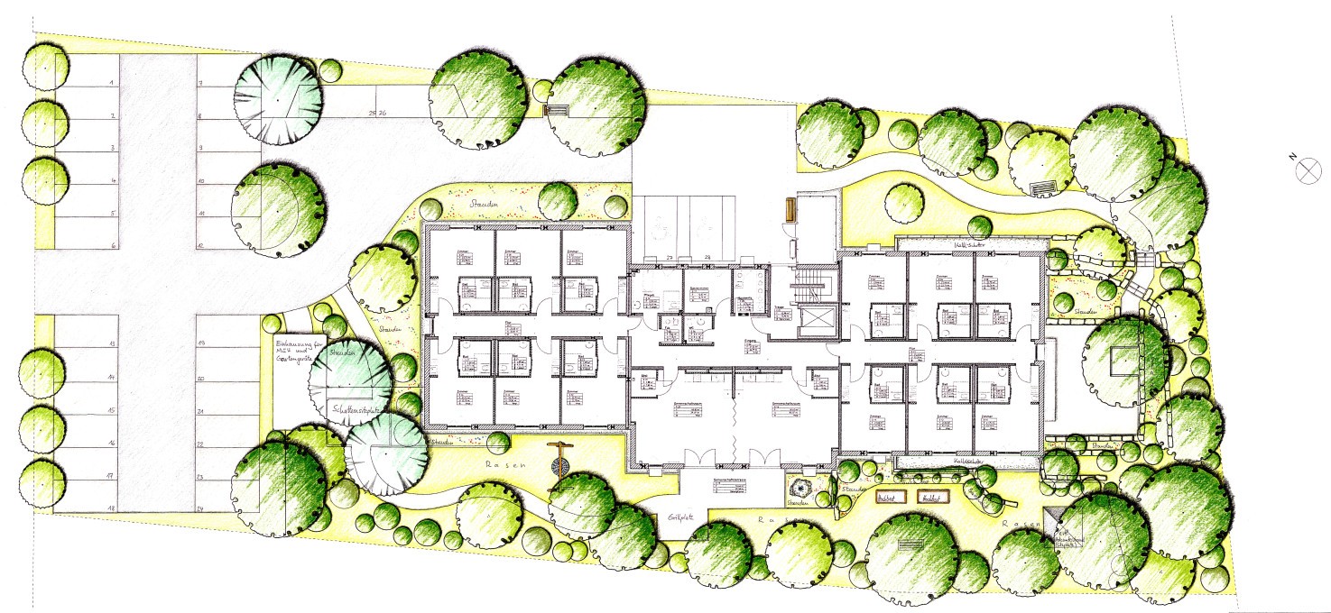 Der beschützte Bereich sollte einen kleinen Nutzgarten bekommen. Neben der Terrasse gibt es noch einen zweiten Sitzplatz am Gerätehaus des Hausmeisters. Eine richtig große Terrasse liegt vor dem Gemeinschaftsraum im Keller. Die Böschungen an den drei Seiten wurden mit großen Muschelkalk-Quadern abgefangen.